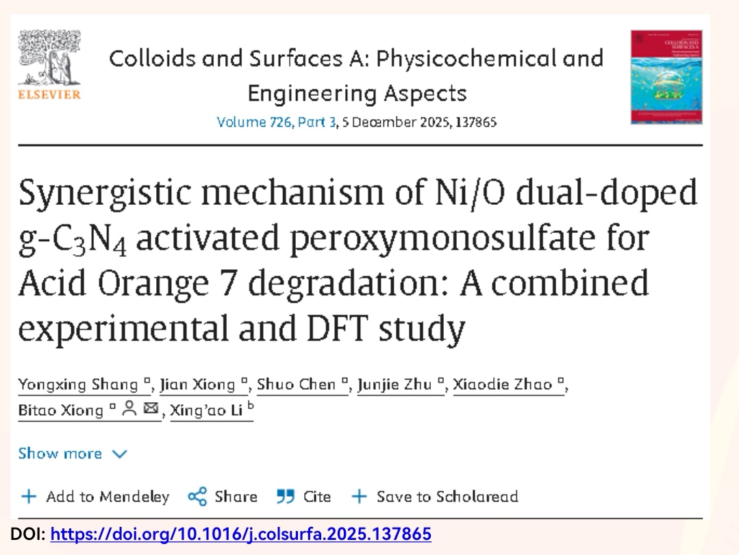 应用物理2022级本科生商永兴以第一作者身份在《Colloids and Surfaces A: Physicochemical and Engineering Aspects》期刊上发表了题为“Synergistic mechanism of Ni/O dual-doped g-C3N4 activated peroxymonosulfate for Acid Orange 7 degradation: A combined experimental and DFT study”的科研文章。51吃瓜网为第一署名单位,应用物理系熊必涛老师为论文通讯作者。《Colloids and Surfaces A: Physicochemical and Engineering Aspects》是ELSEVIER旗下中科院分区SCI二区期刊。