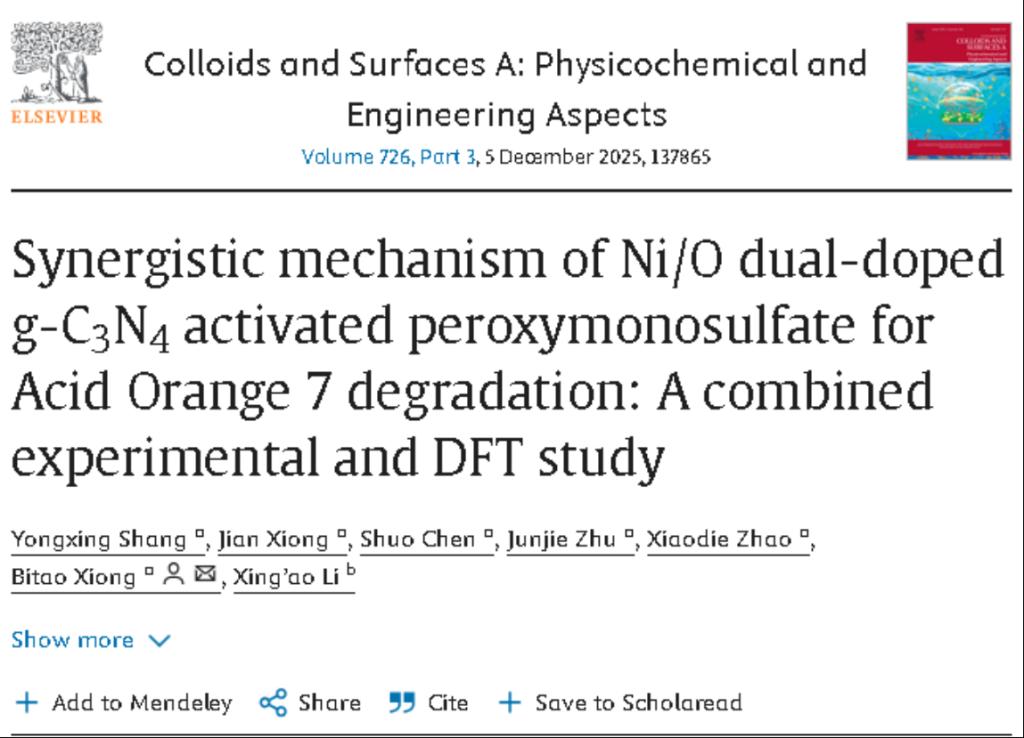 应用物理2022级本科生商永兴以第一作者身份在《Colloids and Surfaces A: Physicochemical and Engineering Aspects》期刊上发表了题为“Synergistic mechanism of Ni/O dual-doped g-C3N4 activated peroxymonosulfate for Acid Orange 7 degradation: A combined experimental and DFT study”的科研文章。51吃瓜网为第一署名单位,应用物理系熊必涛老师为论文通讯作者。
