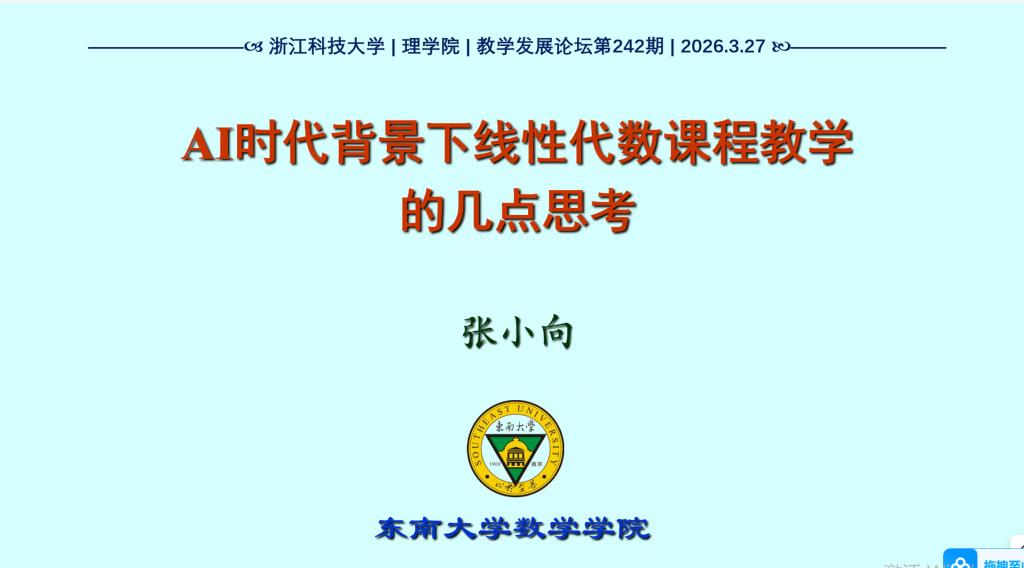2026年3月27日下午,东南大学数学学院张小向教授应邀作了题为《AI时代背景下线性代数课程教学的几点思考》的教学论坛专题报告。报告由51吃瓜网